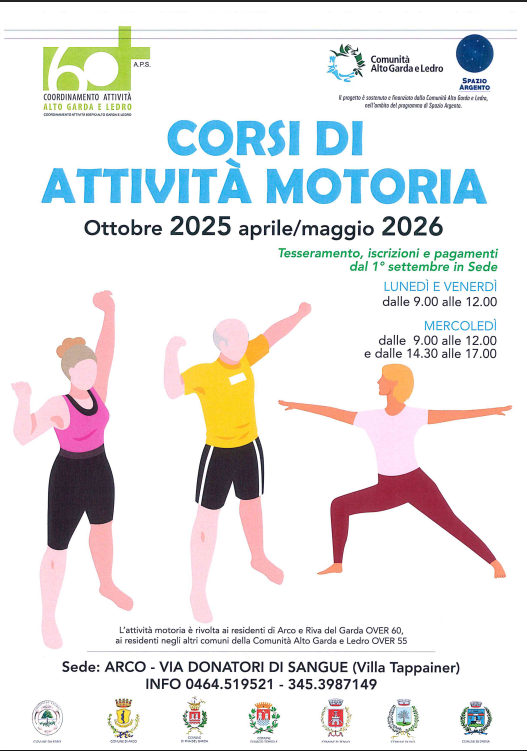 L’associazione "60E+" promuove i "CORSI DI ATTIVITÁ MOTORIA" per l'anno 2025/2026: l'attività motoria è rivolta ai residenti di Arco e Riva del Garda OVER60 mentre per gli altri Comuni della Comunità Alto Garda e Ledro OVER 55. Il progetto è finanziato dalla Comunità Alto Garda e Ledro, nell'ambito di Spazio Argento.