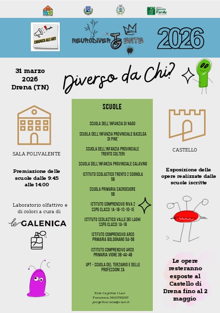 Il 31 marzo 2026, a Drena (TN), si terrà la giornata conclusiva del progetto “Chiamata alle Arti NeurodiverTGente”, che ha coinvolto diverse scuole del territorio.