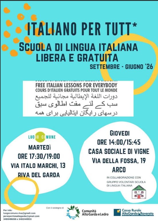 Riprendono i corsi di italiano per stranieri promossi dell'Associazione "Luogo Comune" e dalla Scuola di italiano Penny Wirton Alto Garda, con il sostegno della Comunità Alto Garda e Ledro e la Cassa Rurale Alto Garda-Rovereto.